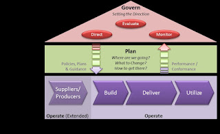 Once these five elements are in place, the actual governance is possible i.e. monitoring the status of all value chains, assessing the needs for a change, and directing the needed adjustment to either drive current or future goals. Planning can be supported by Capability portfolio, which balances risks, resources, investments, current operations and building the future capabilities. The other tool for planning is Architecture. Architecture is describing the structure (people, processes, and technology) from enterprise level down to single technical component level. Enterprise Architecture ensures that planning reflects strategic goals through business, information, and technology layers. A Target Architecture improves communication within development project and ensures that strategic goals and reference architecture guidance are followed.